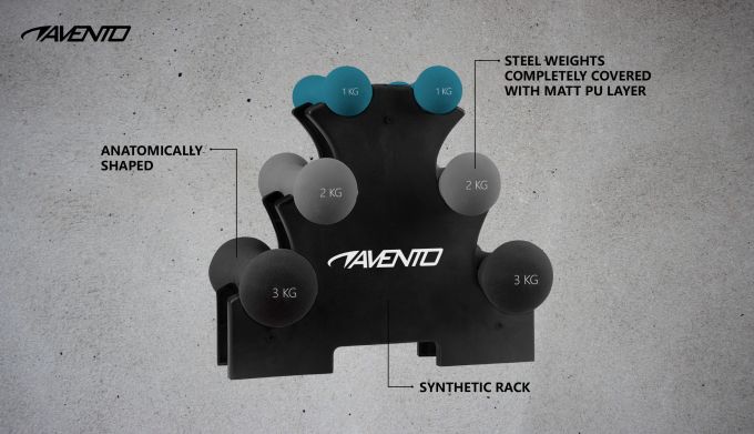 Šiuos hantelius galite naudoti visoms kūno dalims, tokioms kaip riešai, rankos, nugara ir pečiai, stiprinti. Pagaminti iš plieno ir padengti PU sluoksniu. Anatomiškai formos. Rinkinyje yra 3 poros svorio (viso 12 kg) plienas / PU 1x plastikinis stovas 2x1 kg svoriai 2x2 kg svoriai 2x3 kg svoriai