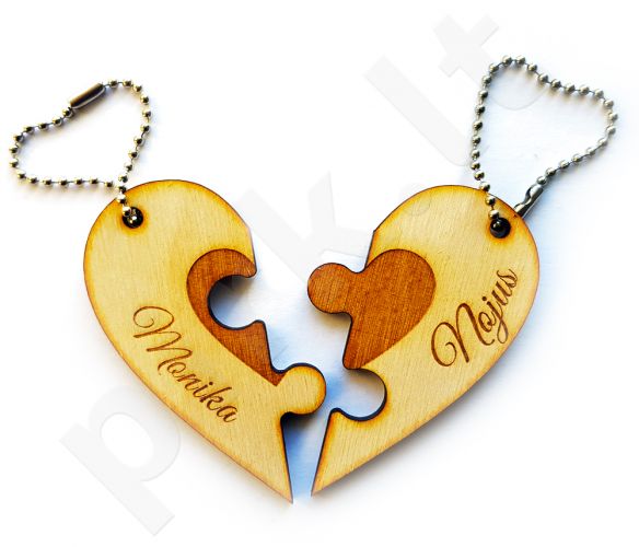 Raktų pakabukų komplektą sudaro du pakabukai, kuriuos sujungus, iš atskirų puselių, susideda širdelė.